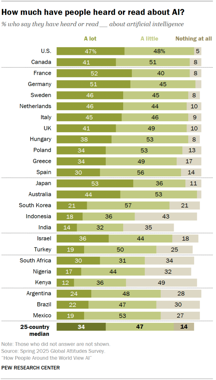 일본이 인공지능에 대한 심층적 인식 수준이 세계에서 가장 높은 나라로 나타났다. 미국 퓨리서치센터(Pew Research Center)에서 25개국을 대상으로 조사한 결과, 일본 응답자의 53%가 AI에 대해 “상당히 많이 들어봤거나 읽어본 적이 있다”고 답했다. 반면 한국은 “상당히 많이 들어봤거나 읽어본 적이 있다”라고 답변한 응답자가 21%로 아르헨티나, 브라질, 멕시코와 비슷한 것으로 나타나 충격을 주었다. 조사에서 프랑스(52%)와 독일(51%) 역시 높은 수준의 심층 인식을 보였으며, 전 세계 중앙값은 34%로 나타났다.