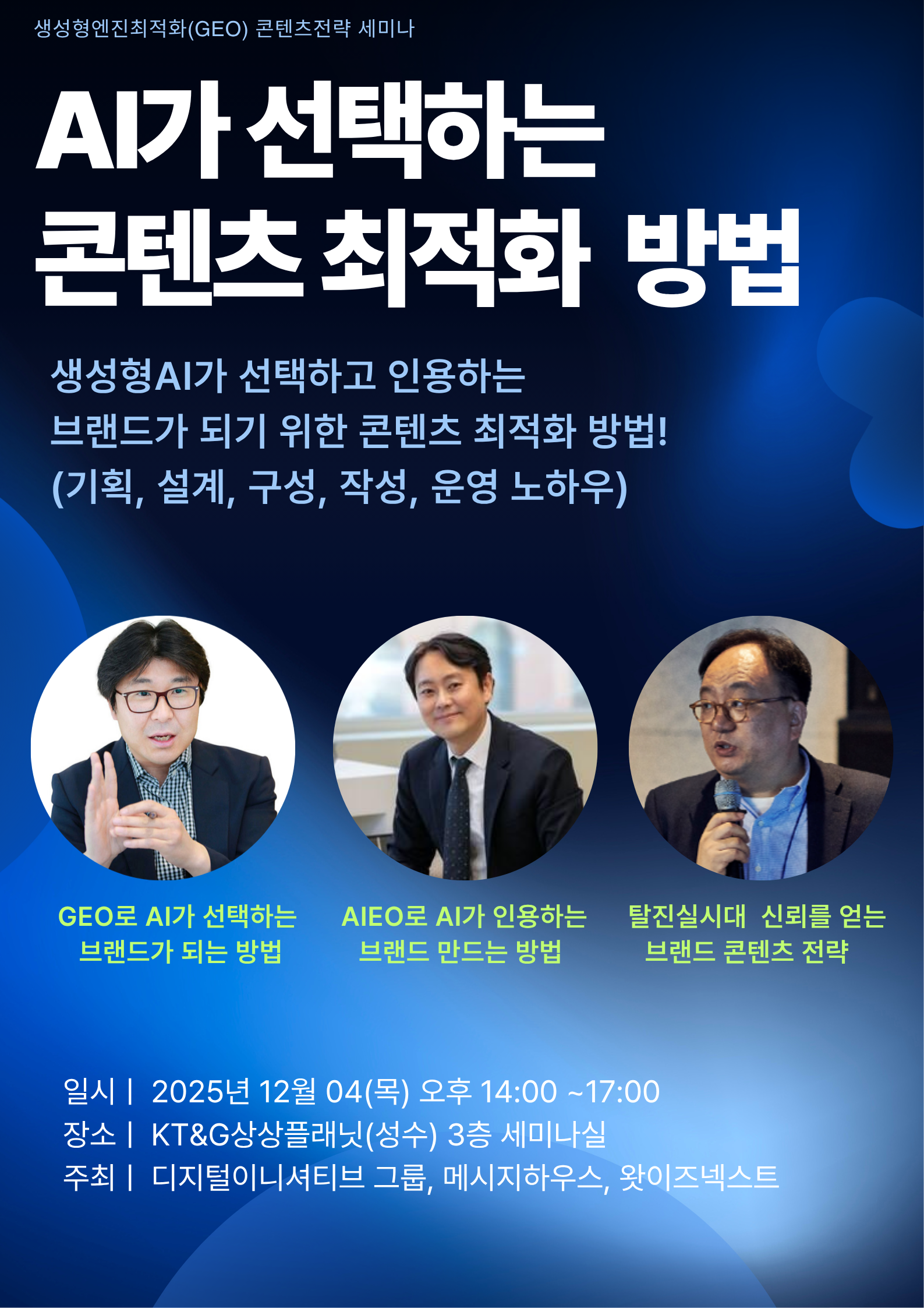 디지털이니셔티브 그룹은 12월 4일(목) ‘AI가 선택하는 콘텐츠 최적화 방법-생성형엔진 최적화(GEO)전략-‘ 이라는 주제로 세미나를 진행합니다.